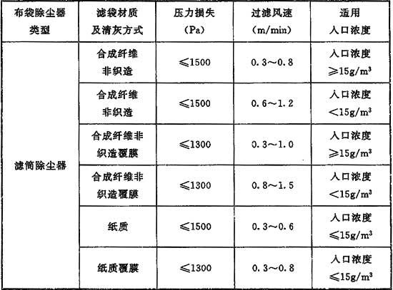 3 過濾風速和除塵效率、濾袋壽命、清灰效果、除塵器壓力損失關系密切,一般來說,較小的過濾風速會提高除塵效率、延長濾袋壽命,改善清灰效果。但過小的過濾風速會造成設備型號偏大,設備初投資增加。國家現行的幾項除塵器設備標準都對除塵器過濾風速、壓力損失等作了規定,總結為表3,根據表3總結為本條第3款。