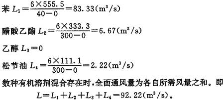 算例:某車間使用脫漆劑,每小時消耗量為4kg。脫漆劑成分為苯50%,醋酸乙酯30%,乙醇10%,松節油10%,求全面通風所需的空氣量。