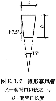 E.1.7 選用套管法時,可用輕質板材或膜材做成與風口內截面相同或相近、長度大于2倍風口邊長的直管段作為輔助風管,連接于過濾器風口外部,在套管出口平面上,均勻劃分小方格,方格邊長不大于200mm,在方格中心設測點。對于小風口,最少測點數不少于6點。也可采用錐形套管,上口與風口內截面相同或相近,下口面積不小于上口面積的一半,長度宜大于1.5倍風口邊長,側壁與垂直面的傾斜角不宜大于7.5°,以測定截面平均風速,乘以測定截面凈面積算出風量(圖E.1.7)。
