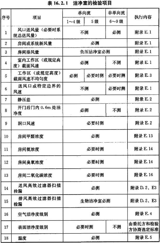 16.2.1 潔凈室在高效過(guò)濾器現(xiàn)場(chǎng)檢漏后的必測(cè)項(xiàng)目,應(yīng)符合表16.2.1的要求,也可由該表選擇選測(cè)項(xiàng)目。