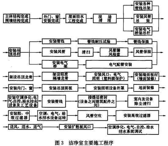 9.1.1 三級(jí)和四級(jí)生物安全實(shí)驗(yàn)室是有負(fù)壓要求的潔凈室,除了在結(jié)構(gòu)上要比一般潔凈室更堅(jiān)固、更嚴(yán)密外,在施工方面,其他要求與空調(diào)凈化工程是基本一致的,為達(dá)到安全防護(hù)的要求,施工時(shí)一定要嚴(yán)格按照潔凈室施工程序進(jìn)行,潔凈室主要施工程序參考圖3。